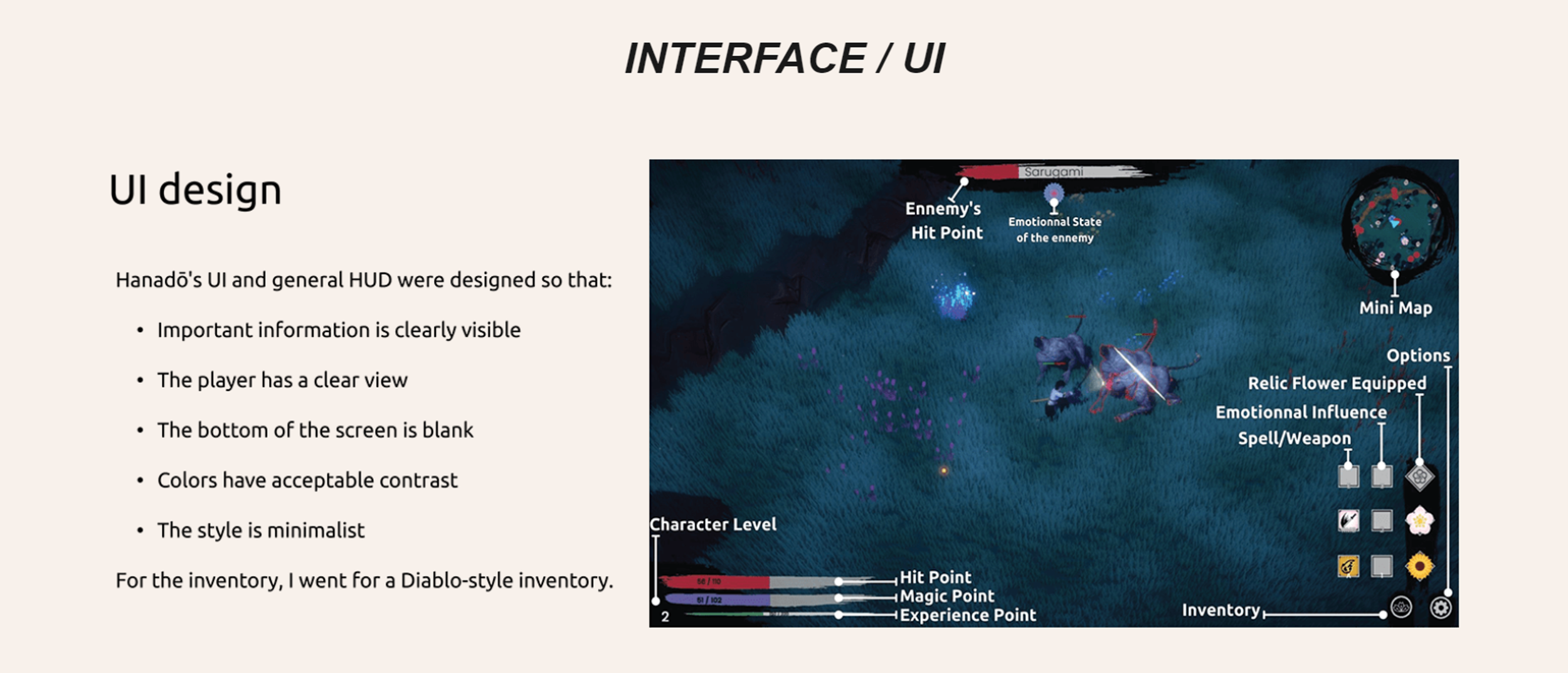 Combat Design : Conception des systèmes d'armes, de combos, de compétences et de buffs (via des fleurs).