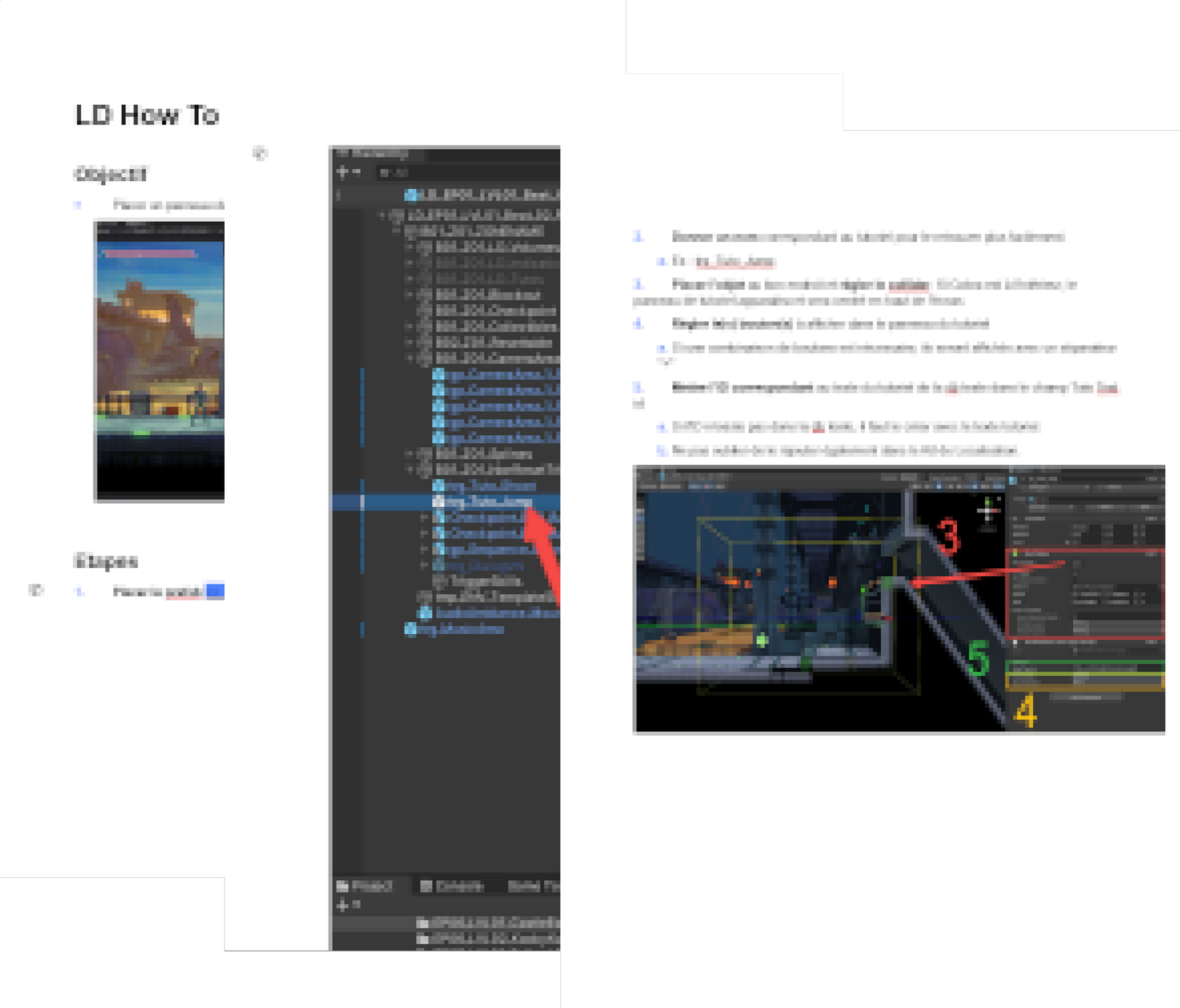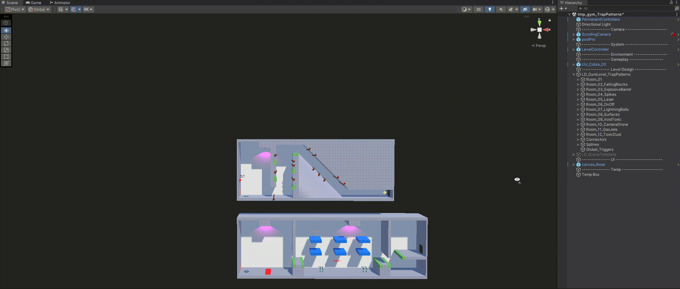 Mon Rôle : J’ai posé le premier design des pièges et éléments interactifs, puis j'ai conçu et documenté l'architecture de ces systèmes. Cela incluait l'établissement de conventions de nommage, la création de prefabs-templates, et la rédaction de règles d'intégration claires pour le LD. Cette approche a permis de paralléliser le travail et de garantir la scalabilité des niveaux.