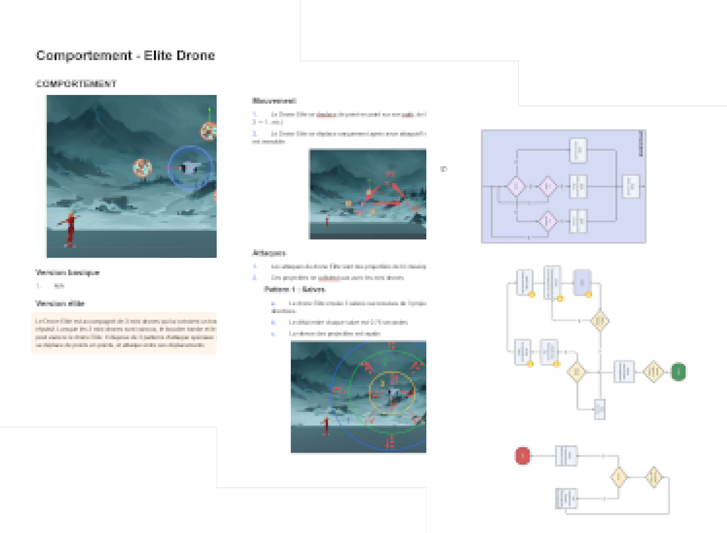 Mon Rôle : J'ai pris en charge le design de plusieurs miniboss et ennemis d'élite, du concept initial au comportement final. J'ai été méthodique, avec un prototypage rapide dans des gyms levels pour itérer sur leurs mécaniques de base (attaques, déplacements, faiblesses) et valider la direction créative en continu.