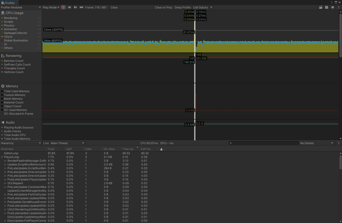 Ma Solution : J'ai utilisé les outils de profiling pour identifier les bottlenecks (CPU & GPU). Mes analyses ont permis de faire gagner du temps aux équipes en pointant des scripts de gameplay non-optimisés, des scènes trop chargées ou assets non-optimisés, problèmes de rendu…etc.